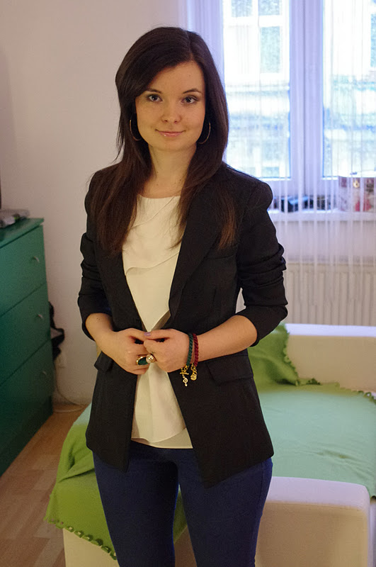 Dziś nie będzie wariacji kolorystycznej- całość zestawu utrzymana w szarościach, jednak jest zabawa fakturami, tzn. zestawienie delikatnej, zwiewnej, lekkiej, letniej spódniczki z grubym, wełnianym swetrem. Żeby nie było zbyt nudno i zbyt szaro założyłam do tego burgundowe botki i ciekawy kolorowy naszyjnik. Na to długa ciepła parka, torebka do ręki i możemy iść na pyszną kawę:)